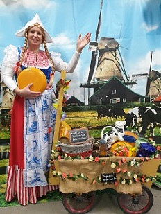 2 kaasmeisjes met kaas uitdelen en een Hollandse Fotoshoot. Typisch Nederlands met bolderkar kan mobiel of op een vaste plek uitgevoerd worden.